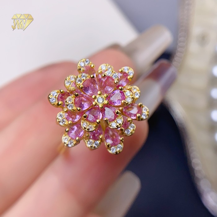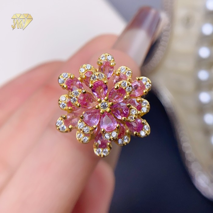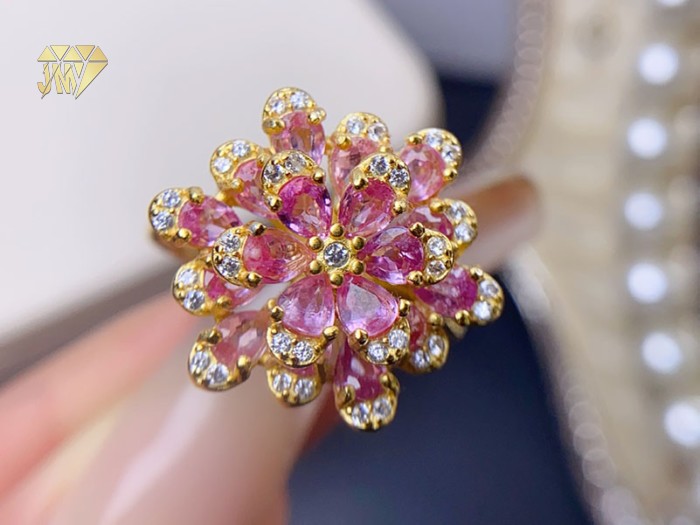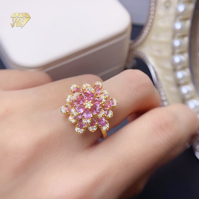 The center stone is a genuine pink natural sapphire – its color reminds you of the first cherry blossom in early spring. Not too bold, yet impossible to ignore. It doesn’t scream like a ruby or feel as cool as a diamond. Instead, it offers a soft, quiet confidence. The band is made of 925 sterling silver with 18K gold plating – a warm golden glow that wraps around the pink petals, as if wearing spring on your finger.